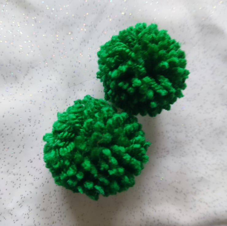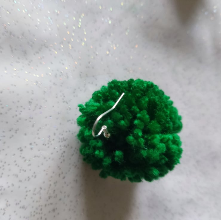 These handmade pom poms in a dark green measure around 4cm across and are attached to a silver coloured ear wire