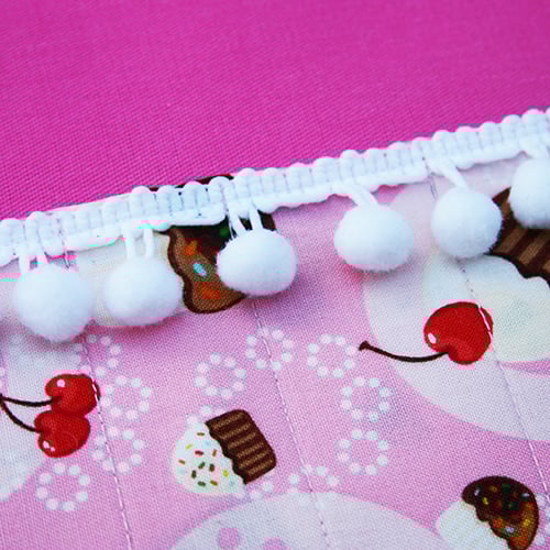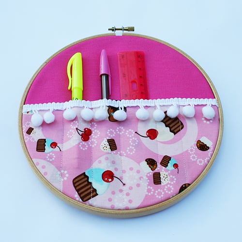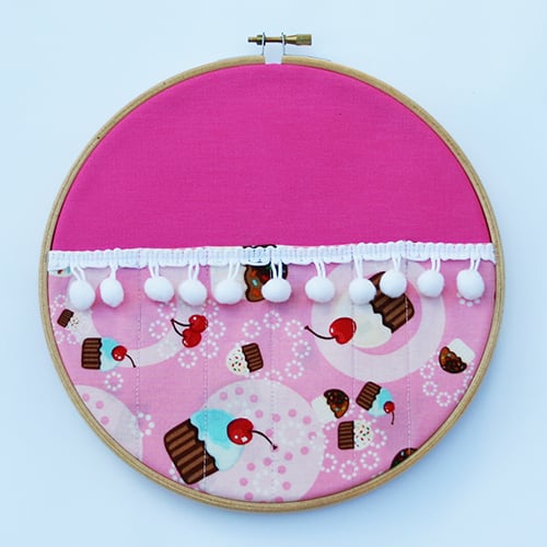 A hoop storage pocket decorated with pretty pompoms. This would look great in a girls bedroom or on the wall of a workroom.
