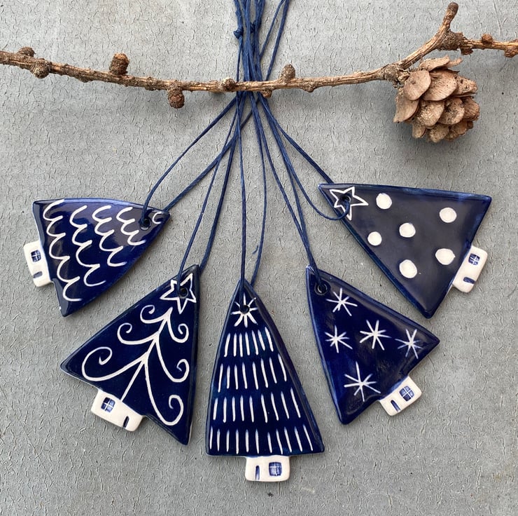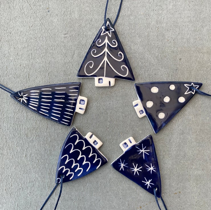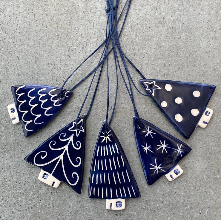 Each decoration is hand made from white earthenware clay, decorated with coloured slips and a hand drawn scraffito design. Navy cotton thread is attached to allow the decorations to be hung.