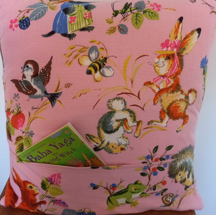 A lovely cushion, made using a very sweet vintage fabric and with a pocket for a story book or cuddly toy.