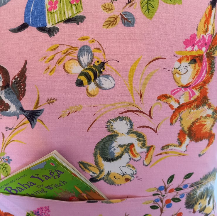The pink vintage fabric depicts little forest animals and the pocket on the front is large enough to hold several books or even cuddly bedtime toys.