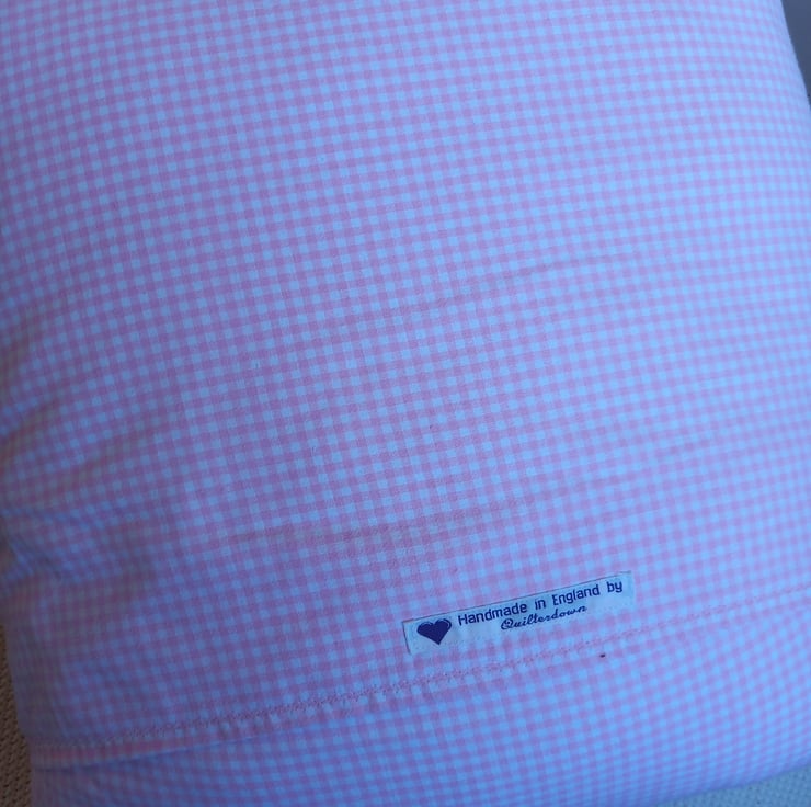 The back of the cushion features a pink/white gingham fabric and an envelope opening.