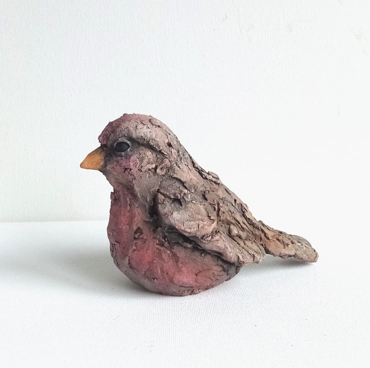 An original ceramic Redpoll sculpture made from terracotta clays and decorated with blended slips and pigments.