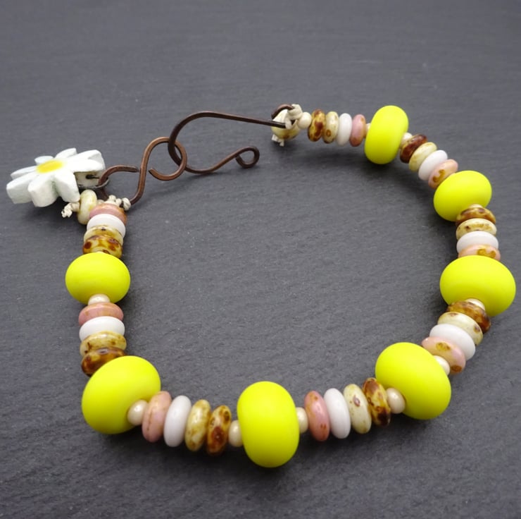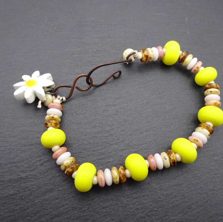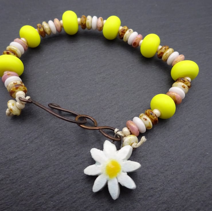 A bracelet made with handmade lampwork glass bead and Czech glass beads. It fastens with a handmade copper hook and features a handmade ceramic daisy charm.
