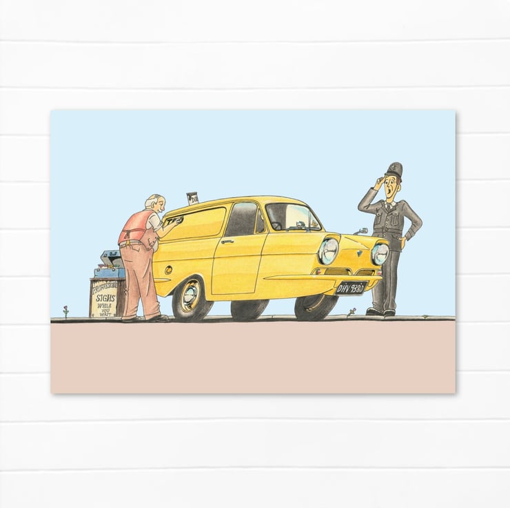 A fun cartoon illustration of a classic van, once a common sight on British roads. Now more famous for being used on TV for comic effect.