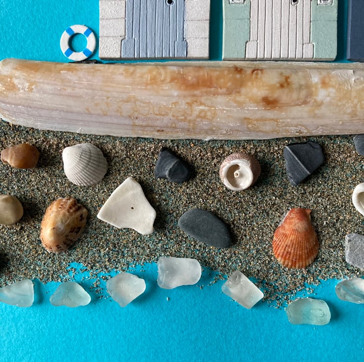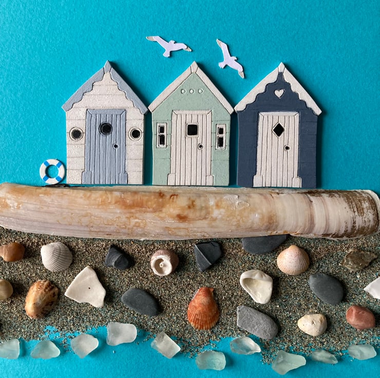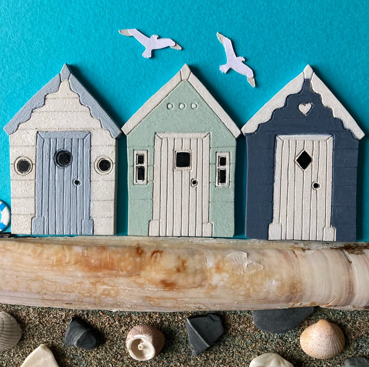 Three lovely little wooden beach huts hand painted by myself in jetty blue, chalk white and duck egg blue. Decorated with shells, pebbles, sea glass, sand and a razor clam shell that I have collected from beaches in Cornwall.
