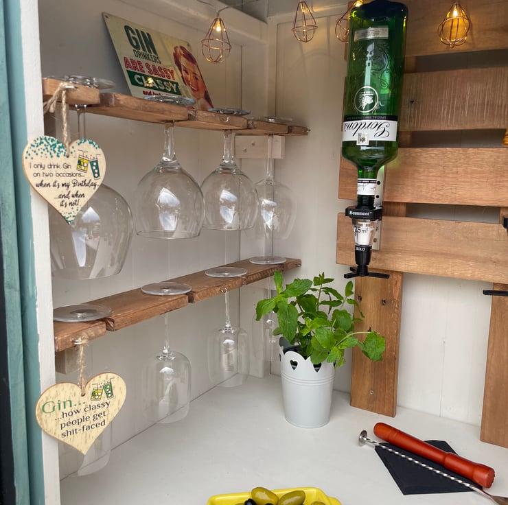 Internally the Gin Bars are painted in Cuprinol Jasmine white. Externally painted in Cuprinol Seagrass or any other Cuprinol Nature’s Netral range