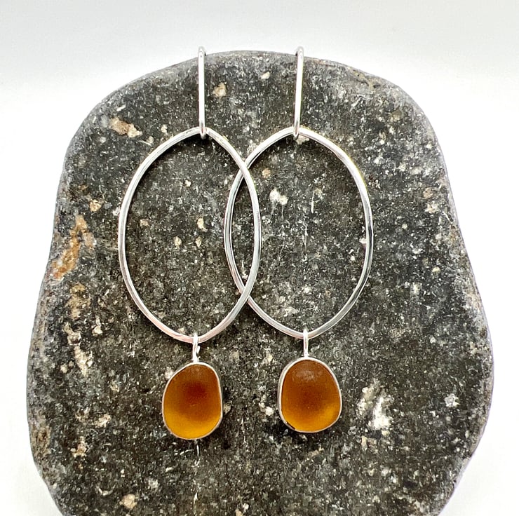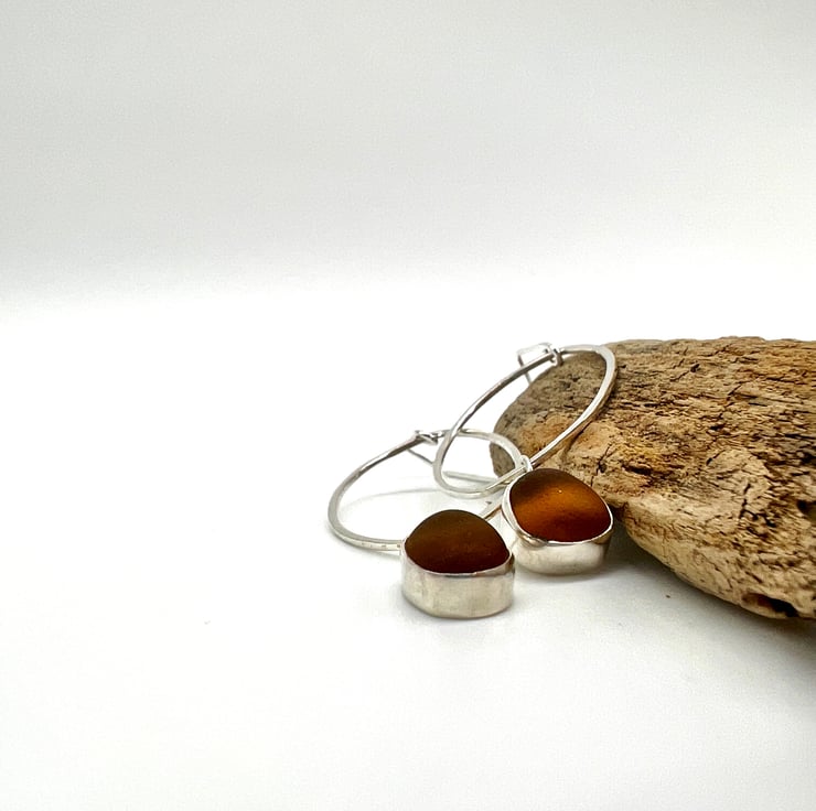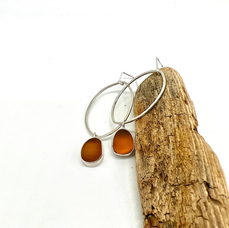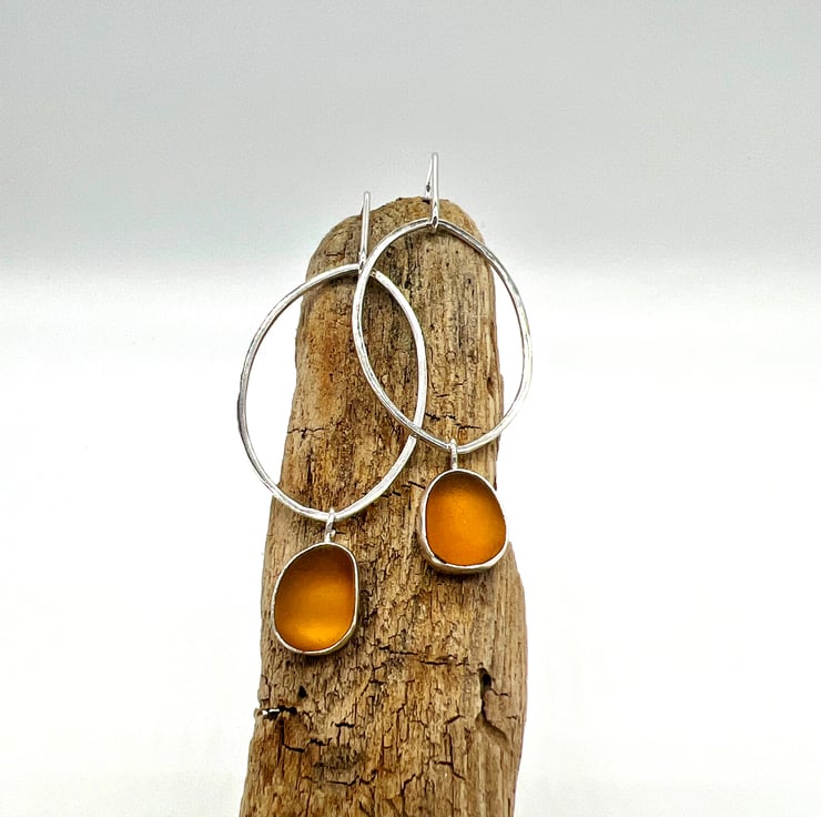 I have set the pieces of sea glass in a handmade sterling silver setting. They have been hung on an irregular hoop and handmade ear hooks.