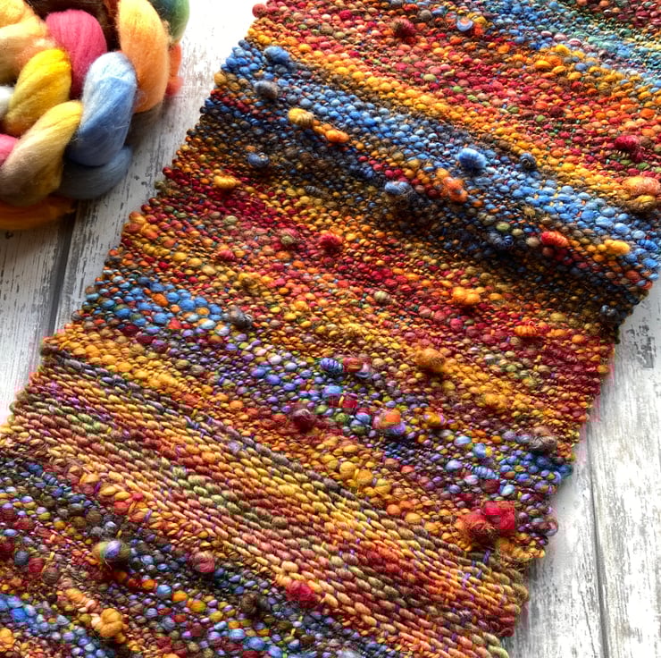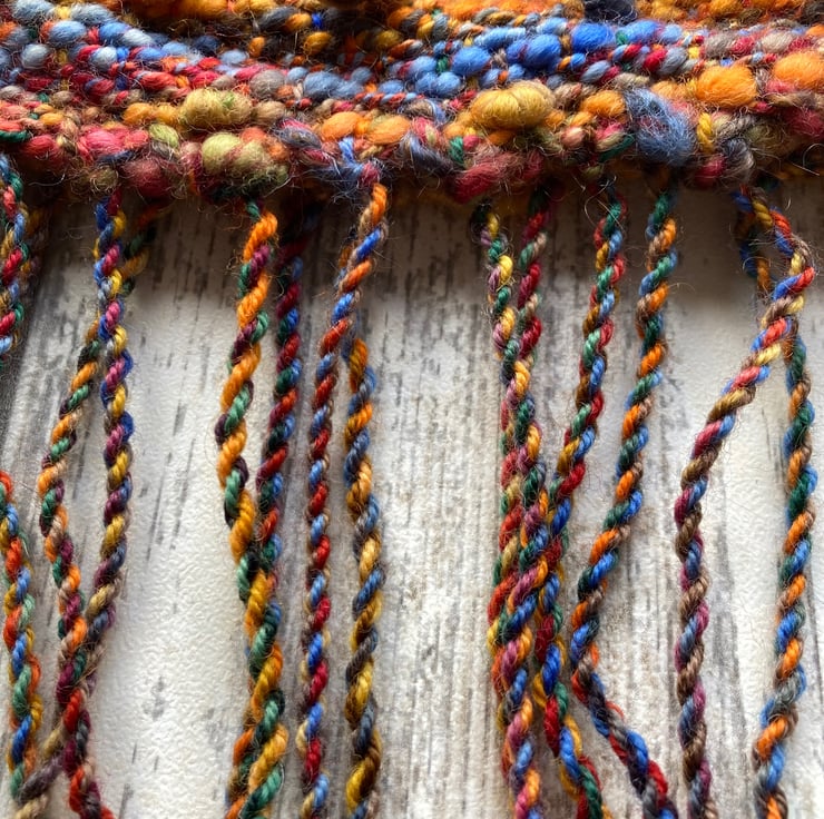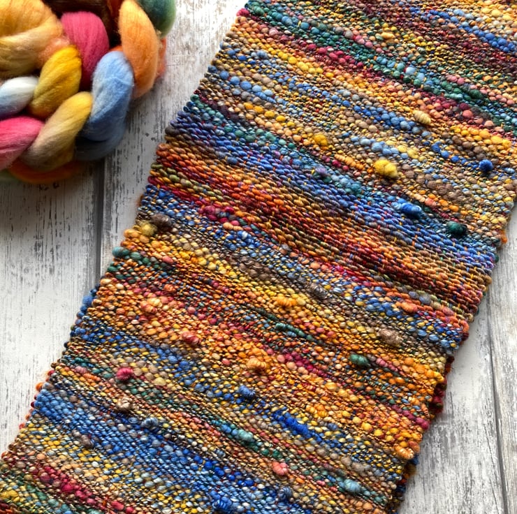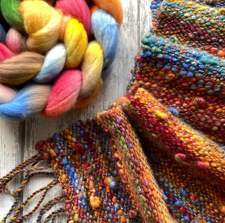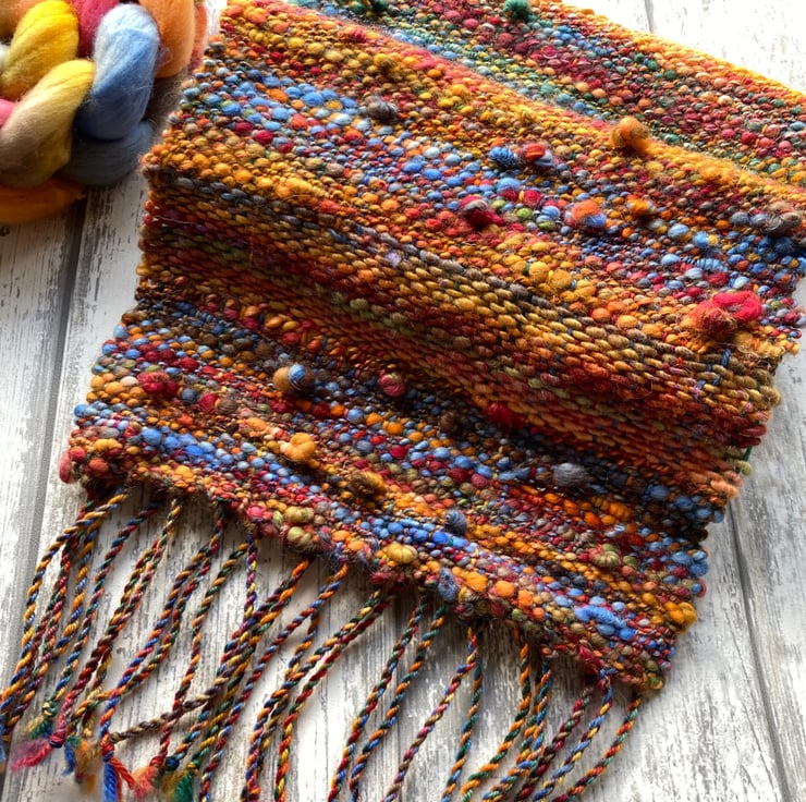 Beautifully soft and drapey scarf made with a blend of Blue faced Leicester and merino. Fibre is dyed by me and then hand spun on my spinning wheel into yarn and finally woven into this delightfully soft scarf on my rigid heddle loom.