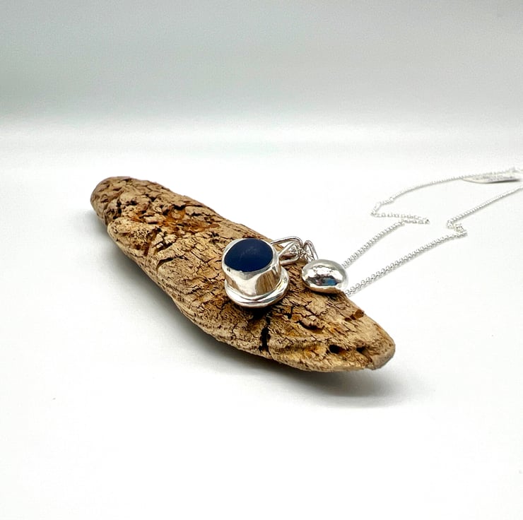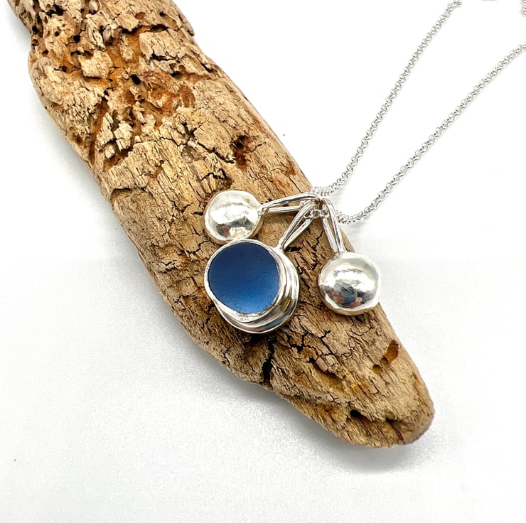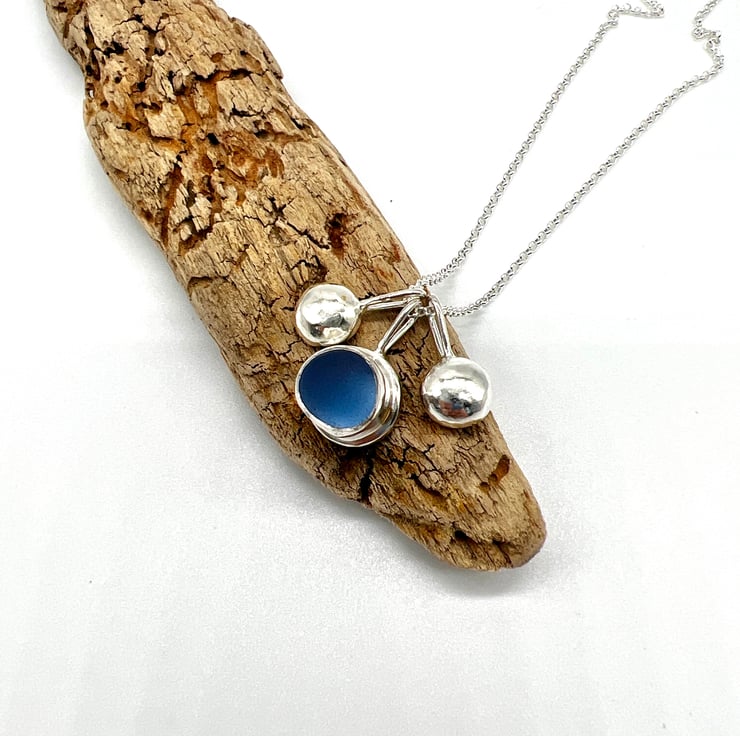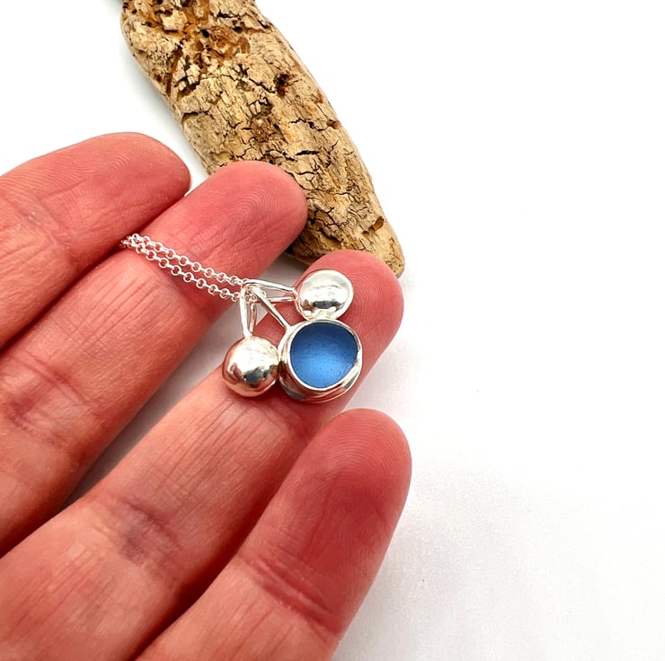 This is a beautiful cornflower blue piece of sea glass. I have set it in a handmade sterling silver setting. It’s accompanied by two sterling silver pebbles.