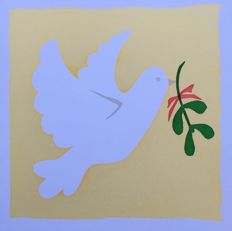 Depicting a single dove carrying mistletoe in its beak, sending love. Background is gold.