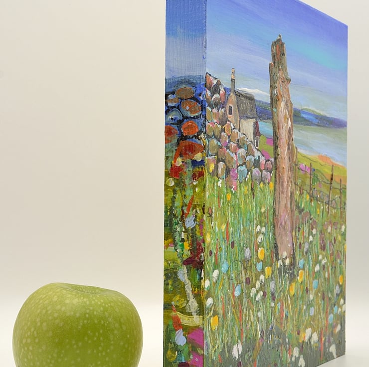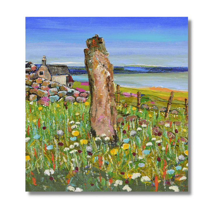 This painting is called, "Time In Stone". Many stones are scattered throughout Scotland. Some form part of a circle whilst others stand alone. They have stood for thousands of years and we are still discovering what they were used for now. I wanted to depict the ancient, still standing proud with a wee house in the background which probably won't last as long.