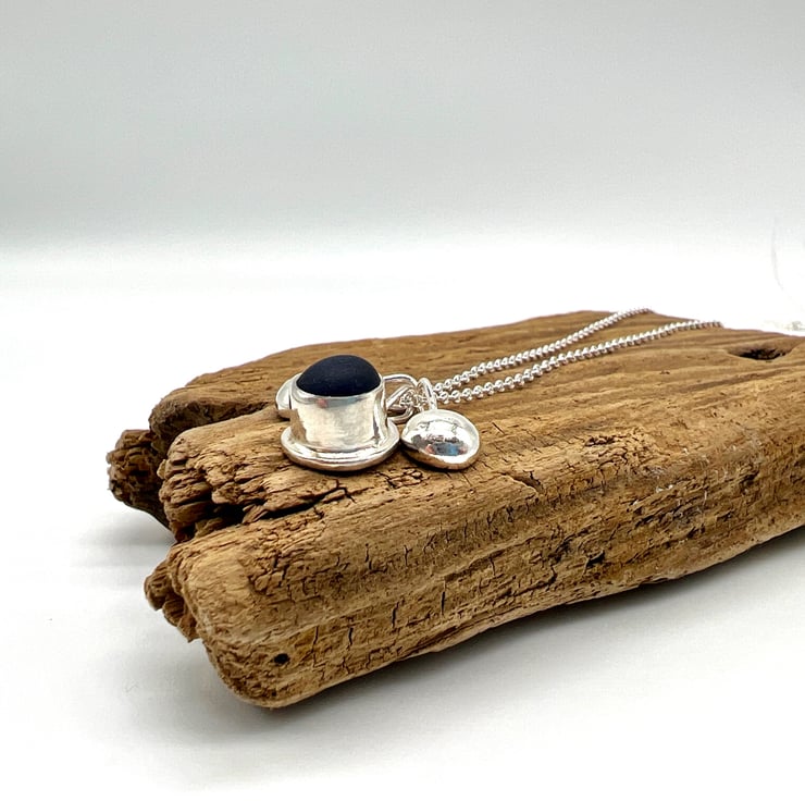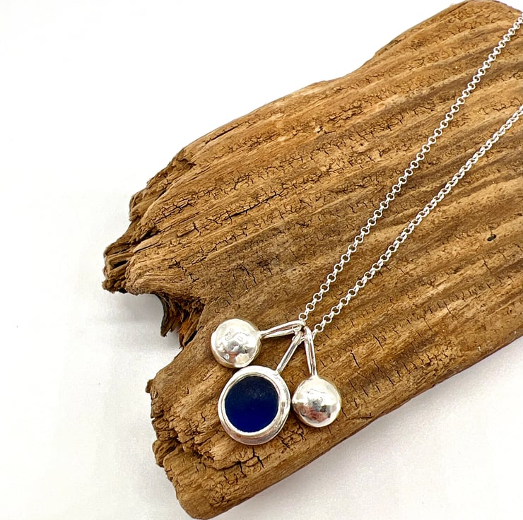 The sea glass pendant and two silver pebbles are hung on an 18 inch sterling silver belcher chain.