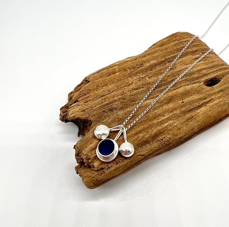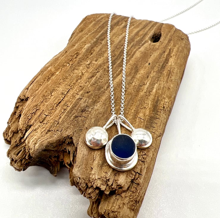 This blue piece of sea glass is very unique and unusual. I have set it in a handmade sterling silver setting. It’s accompanied by two sterling silver pebbles.
