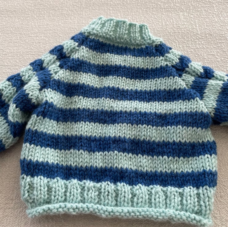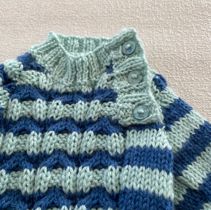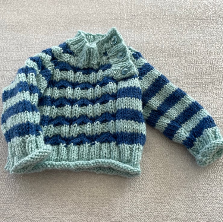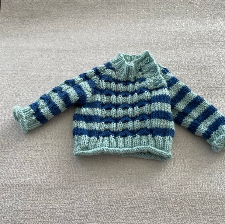 The jumper is hand knitted in a wool and nylon yarn. It is worked in stripes of blue and aqua with a cable panel at the front and running up the centre of the sleeve. It fastens at the front raglan sleeve seam with three buttons making it easy to put on.