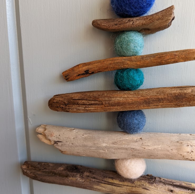 Handmade by myself in Wales from handpicked pieces of interesting driftwood, that has been cleaned before use, and wet-felted coloured wool balls.