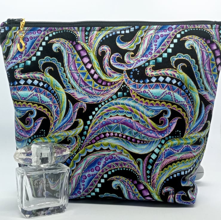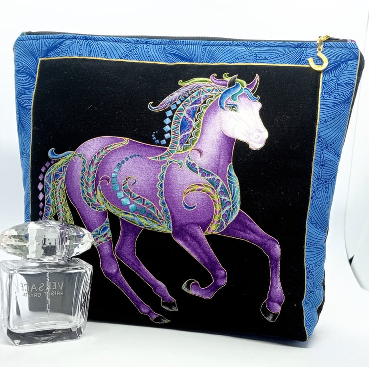 19x22x7 cm in size and wadded it has a black cotton lining and a pretty gold zip pull in keeping with the horse theme.