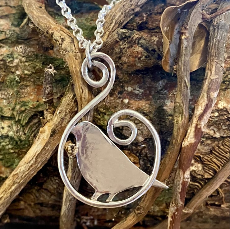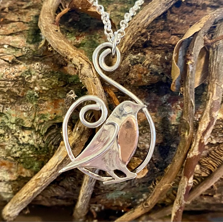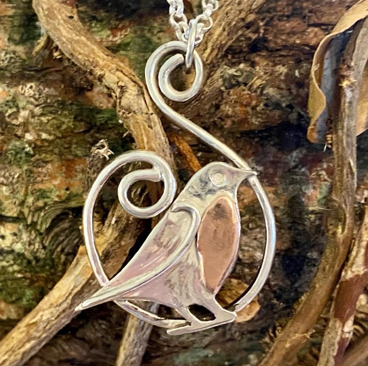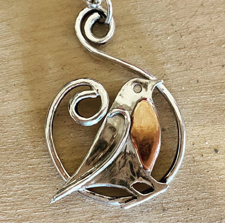 Silver and copper handcrafted Robin positioned on a robins song. Hangs on an 18” silver belcher chain.