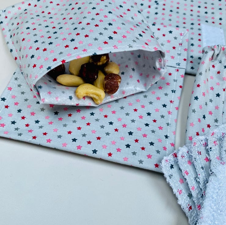 2 Reusable snack bags, fit in a lunch bag, handbag or pocket. Approx. 4” x 5” with a Velcro flap at the top to secure the contents.