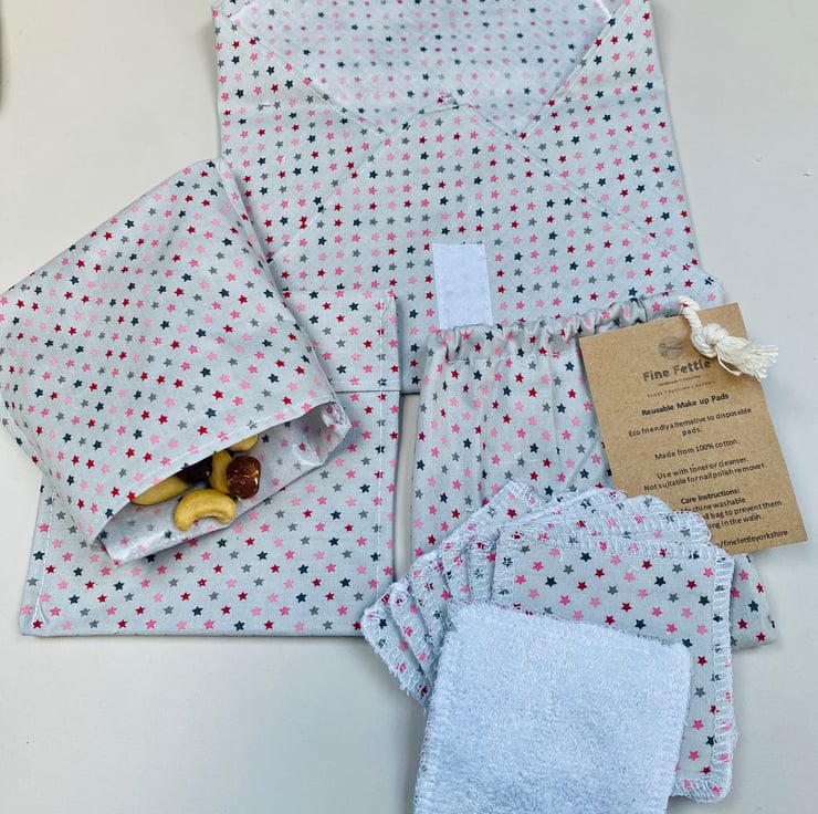 This Zero Waste Self Care Gift Set, contains matching Reusable Sandwich Wrap, Snack Bags and Make up remover pads.