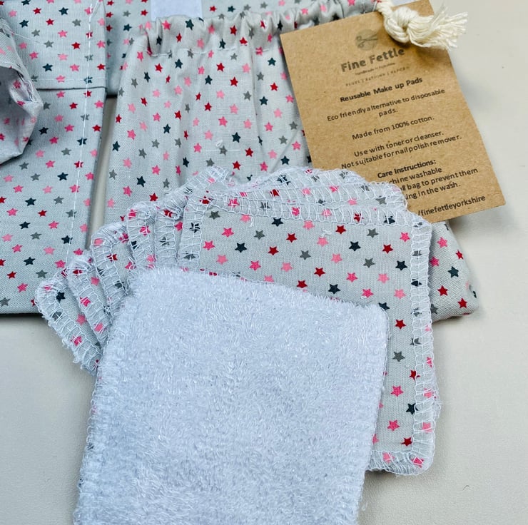 Set of 7 reusable make up remover pads each made from cotton towelling measuring approx 3” square.
