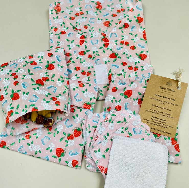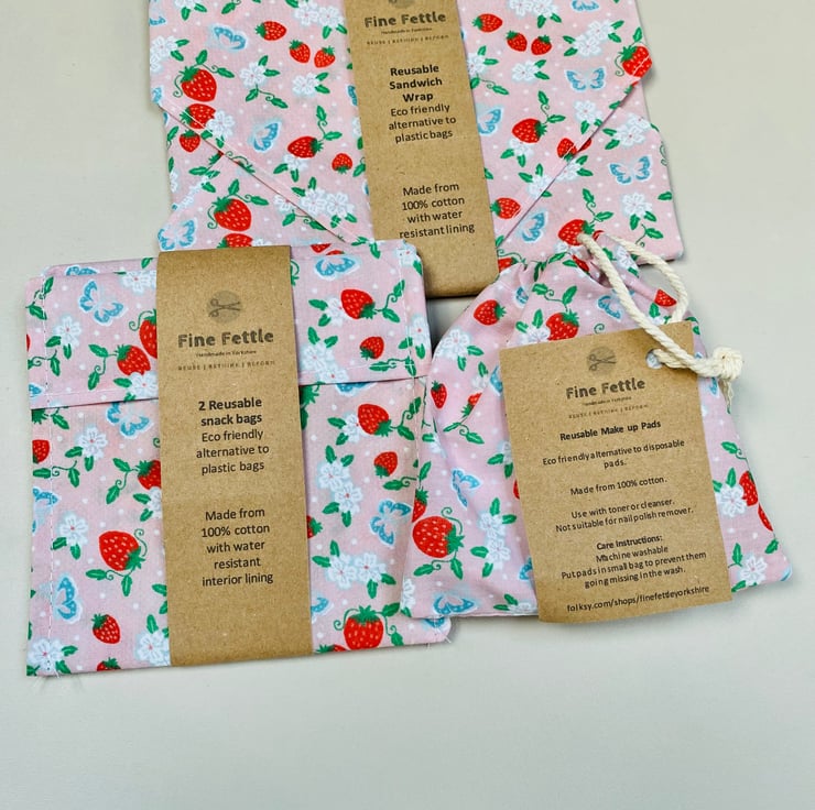 This Zero Waste Self Care Gift Set, contains matching Reusable Sandwich Wrap, Snack Bags and Make up remover pads.