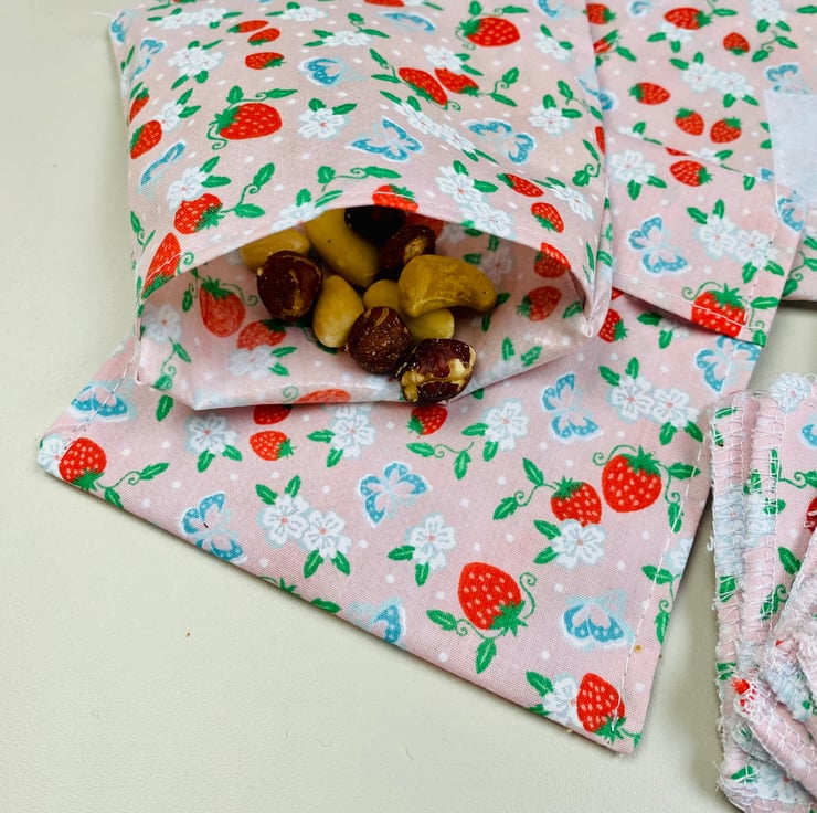 2 Reusable snack bags, fit in a lunch bag, handbag or pocket. Approx. 4” x 5” with a Velcro flap at the top to secure the contents.
