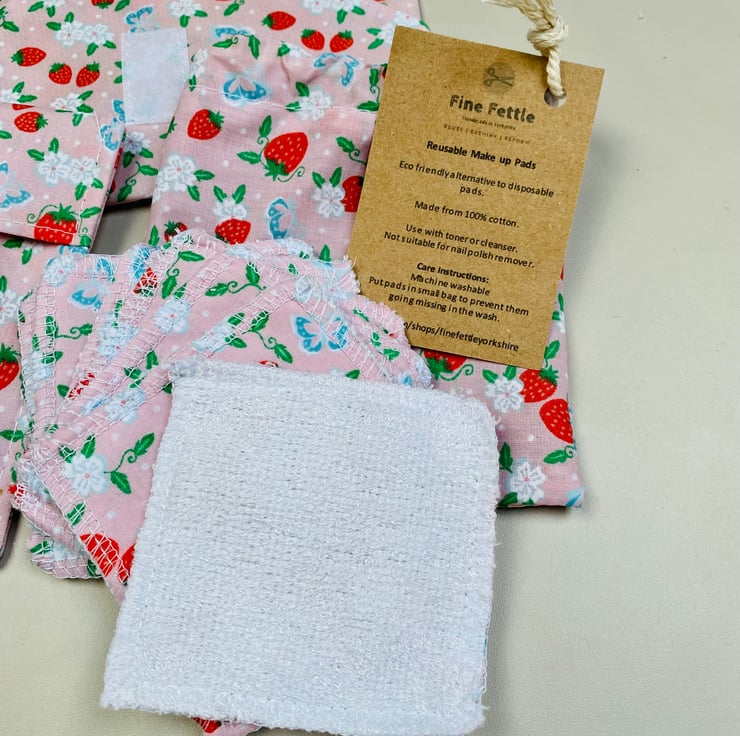 Set of 7 reusable make up remover pads each made from cotton towelling measuring approx 3” square.