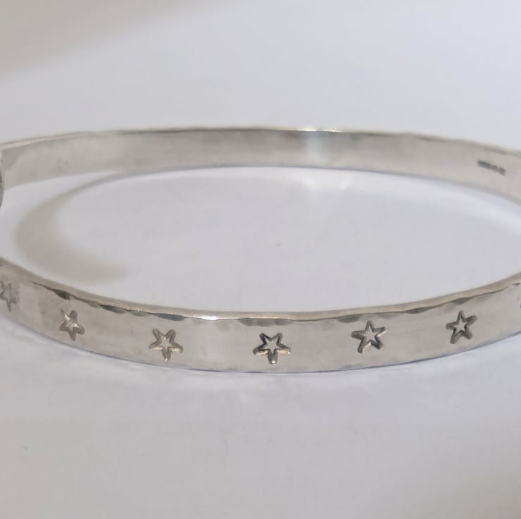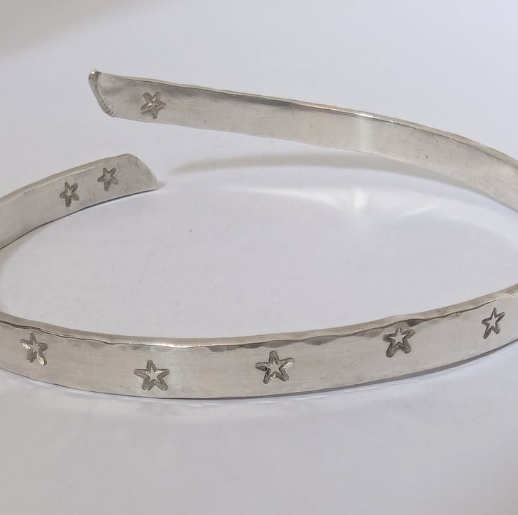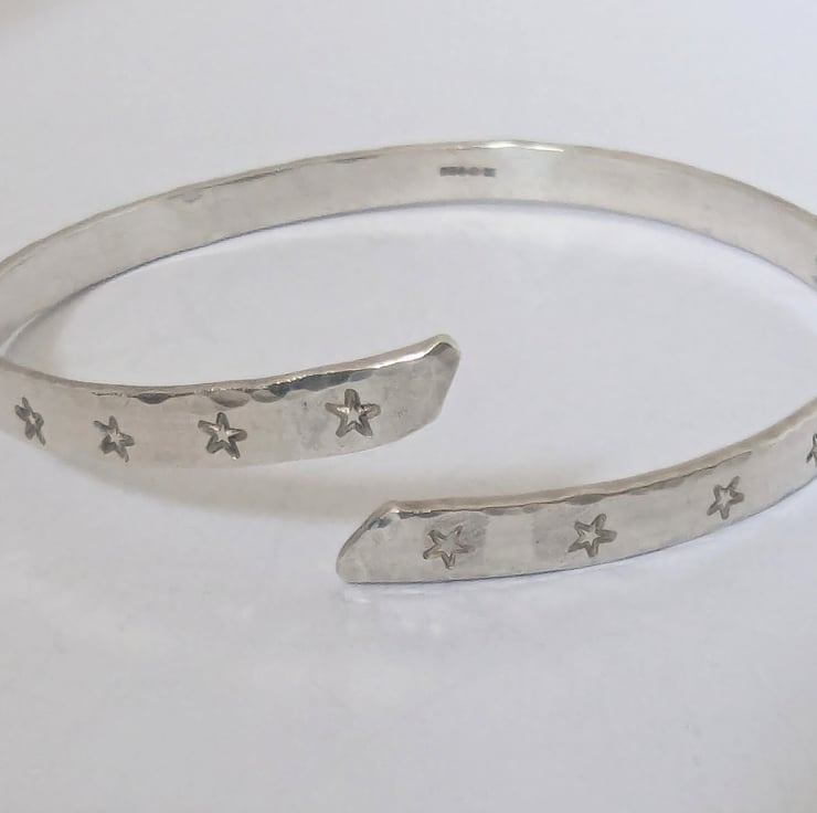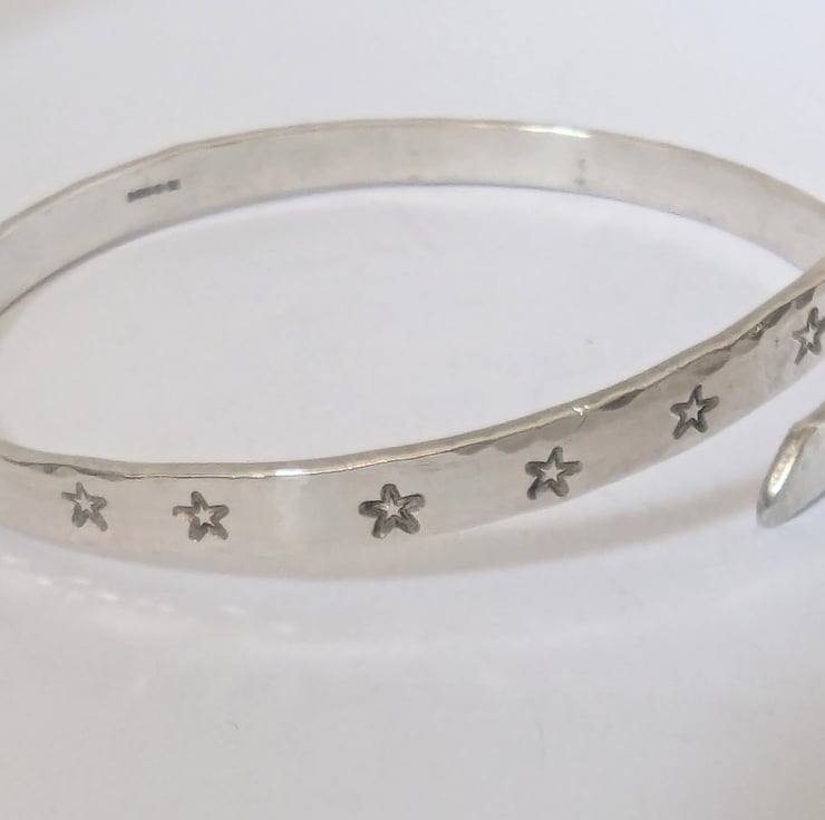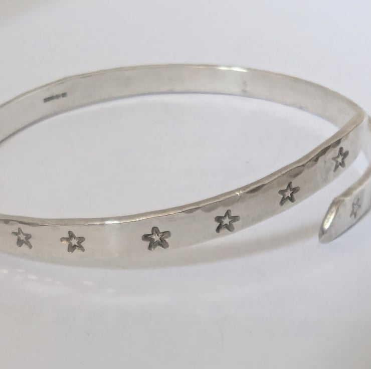 This is an open bangle, made from recycled sterling silver and hammered into a round shape, measuring approximately 6.5 cm across. I have stamped cute little stars around the outside of the bangle and three little stars hidden on the inside. I have hammered the edge of the bangle to create a sparkly bevelled edge.