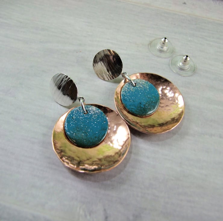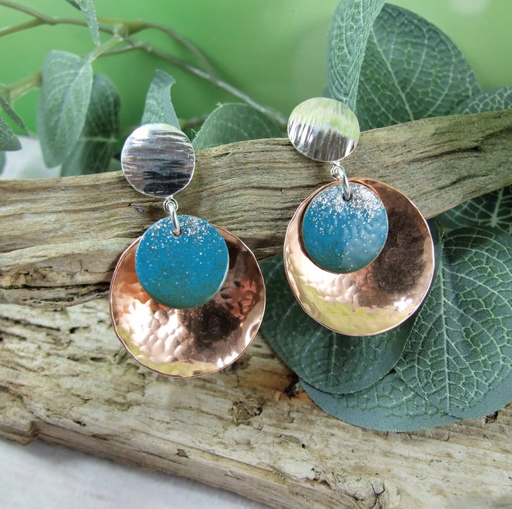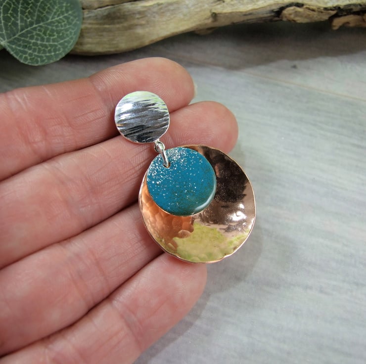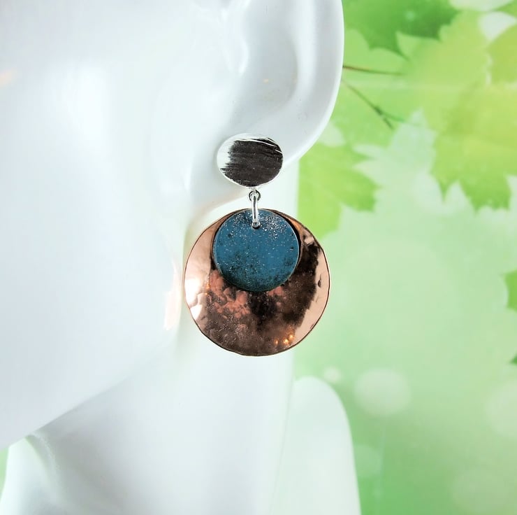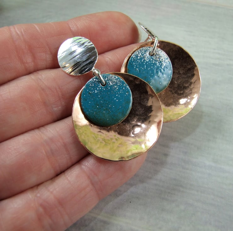 The large discs are cut from copper sheet and hammered for texture then slightly domed. I have fitted these to sterling silver stud fittings, made from recycled silver sheet cut into circles and .925 silver posts fitted. Final addition are little copper circles coated with blue enamel to add a splash of colour. The enamel is a fine powder and has been applied by hand with a tiny sieve overlaping the colours for a graduated effect then fired at a low temperature melting and giving it a nice glossy finish.