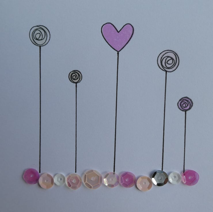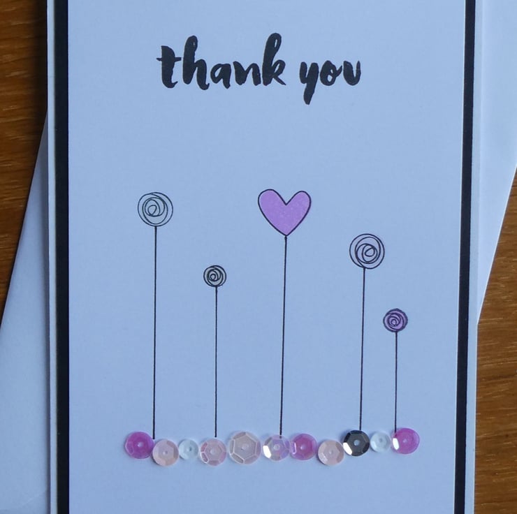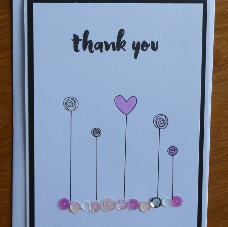 This thank you card has a hand stamped message in a black brush stroke style font with hearts and flowers above an undulating row of sequins in shades of pink, white and silver.