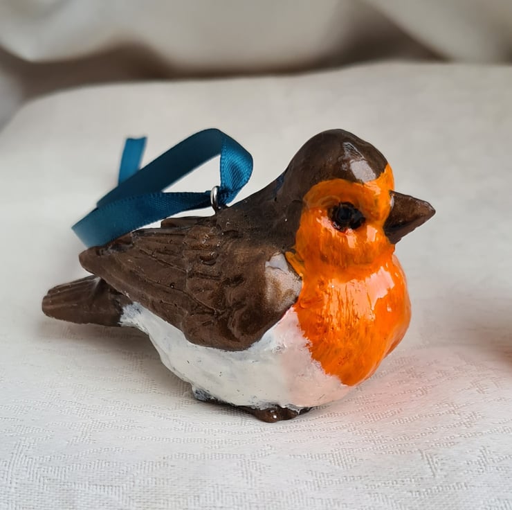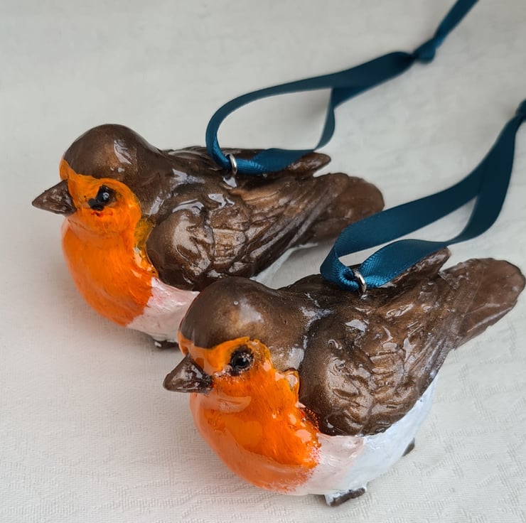 A cute pair of Bird-shaped hanging decorations in a beautiful Bronze tone resin, painted to look like Robins. These lovely little birds hang on gorgeous Teal Satin ribbons. Unusual and unique these little ornaments can be hung on your Tree or wherever you want. Great for those who love Robins or Bird gifts.