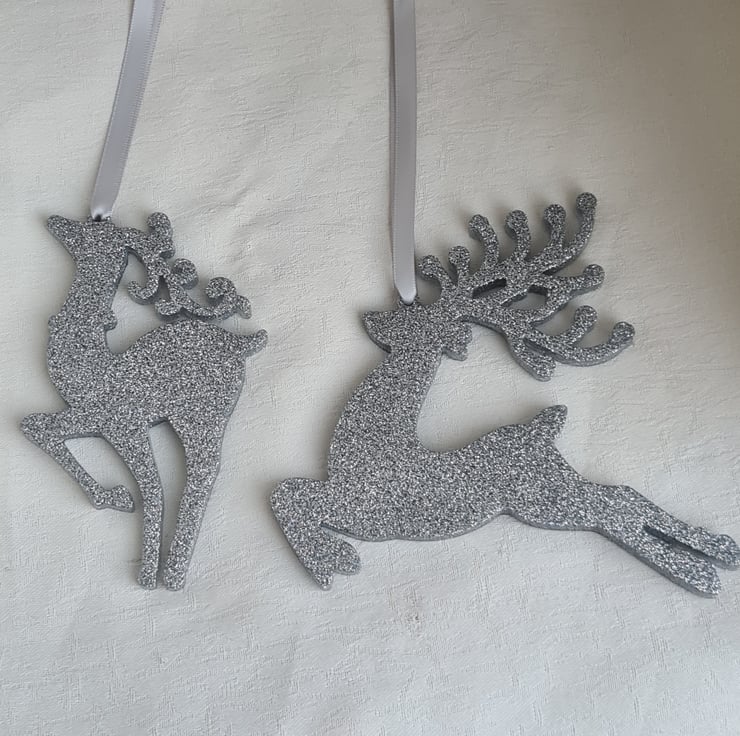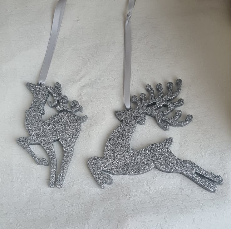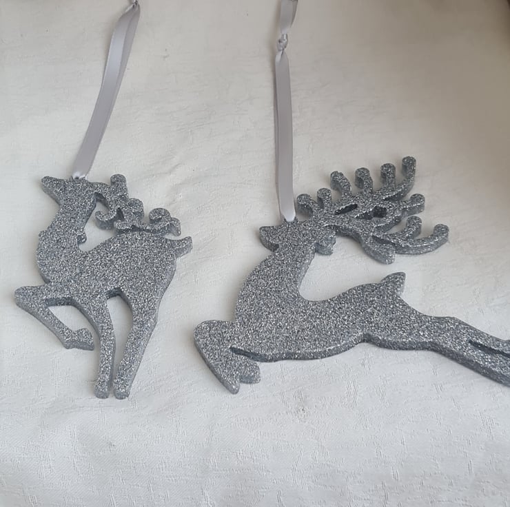 Reindeer ornaments come as a pair and are flat shapes hung on Silver Satin ribbons. They measure approx (left reindeer)11cm H x 7.5cm W x 6mm Thick. (Right Reindeer) 13.5cm H x 13cm W x 6mm Thick. Ribbon length is approx 10cm long.