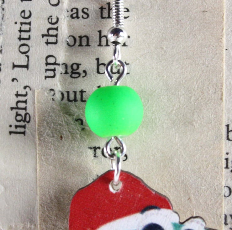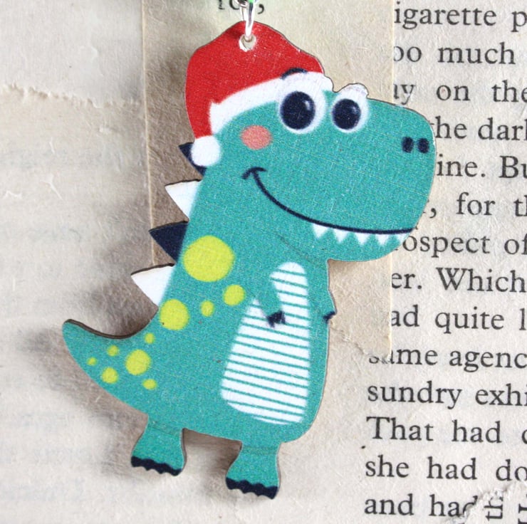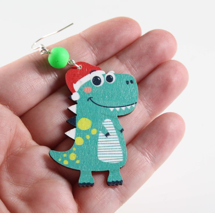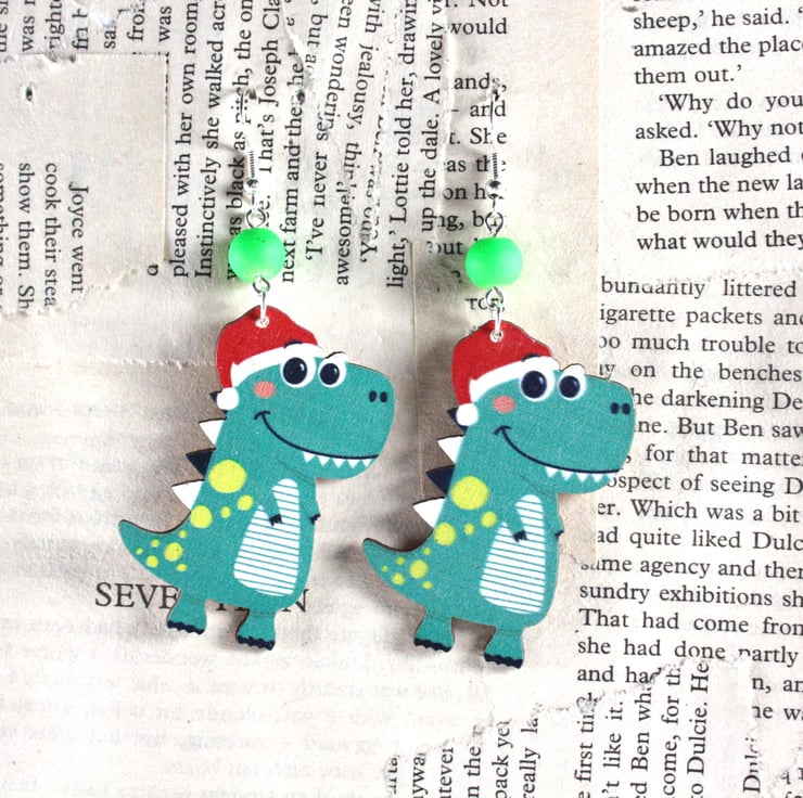 I have two questions. Number 1, do you love dinosaurs? Number 2, do you love Christmas? If you answered yes, then these earrings are for you. And if you answer no, I still insist that these earrings are for you. Who couldn't love a cutie pie dinosaur wearing a Santa hat? And twice over, because a pair of earrings means there's two of them!