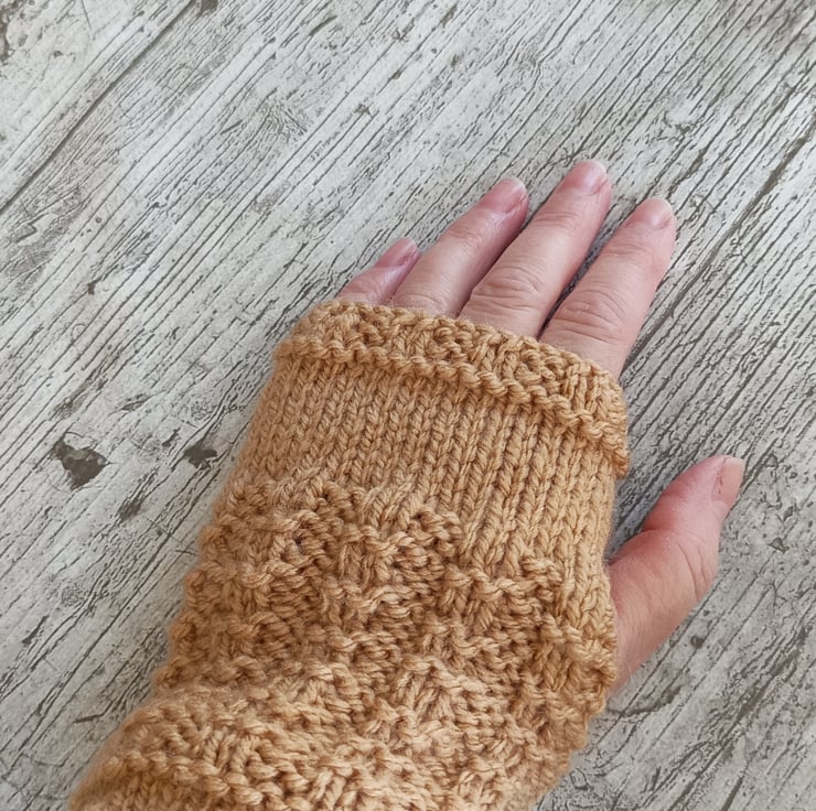 Fingerless knitted gloves in 100% acrylic in a caramel shade.