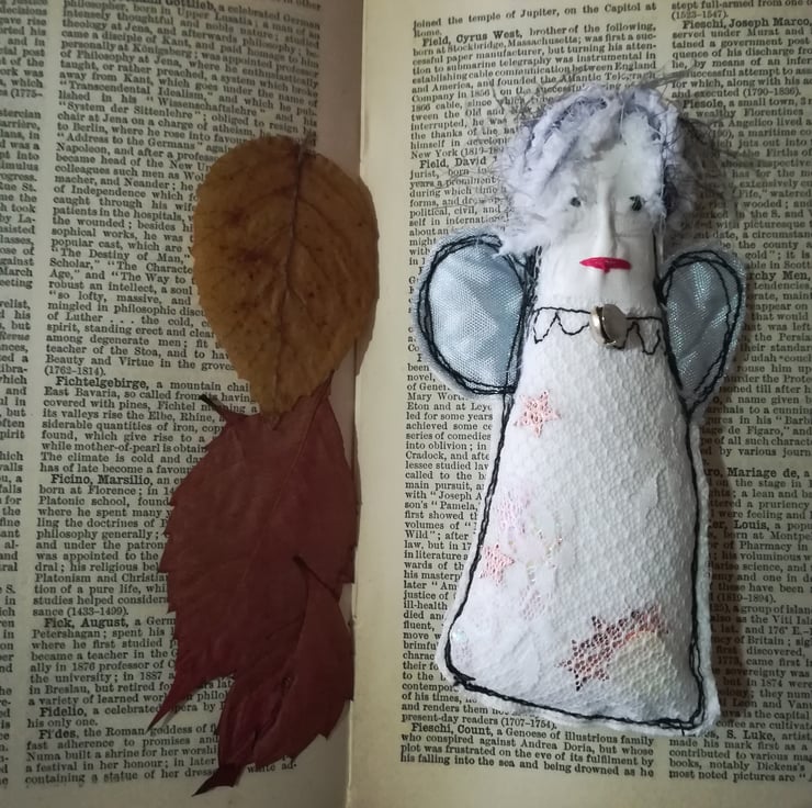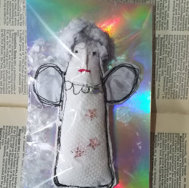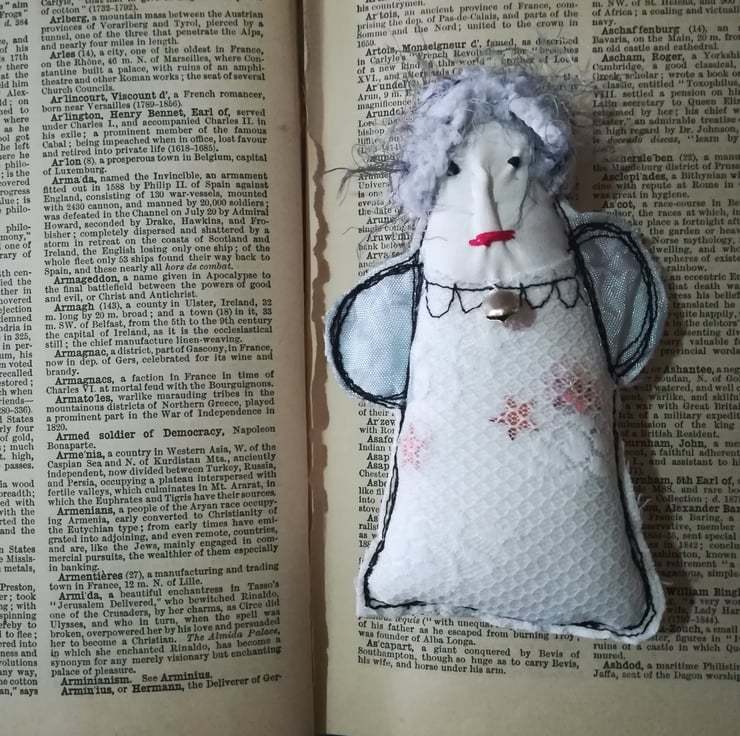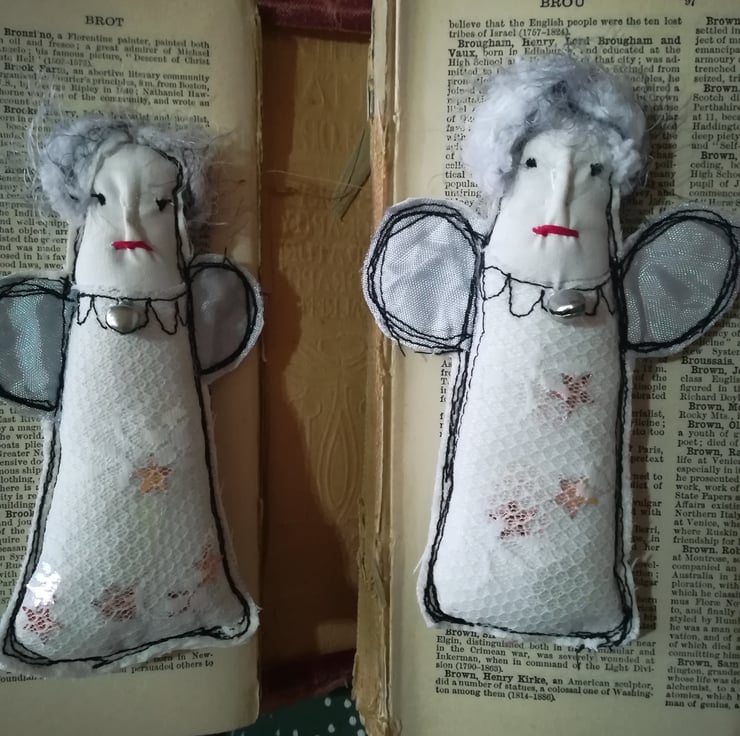 These little hanging angels are made using vintage fabrics and lace netting. They have a little hanging loop and come packaged with snow.