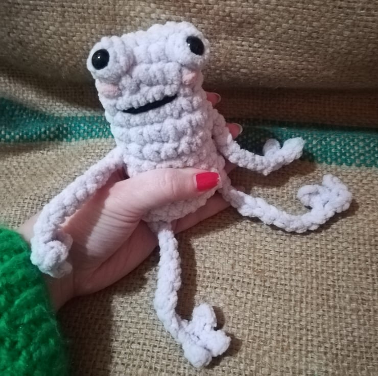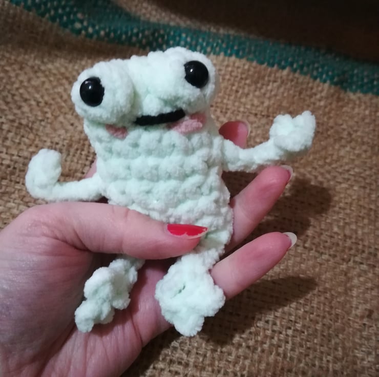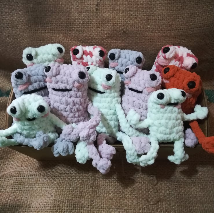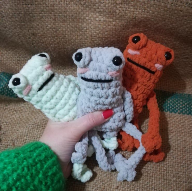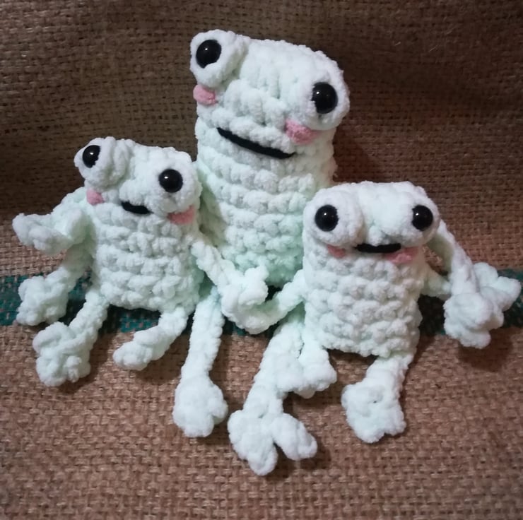 These frogs are crocheted using a lovely soft chunky yarn. They have little rosy cheeks and long arms and legs.