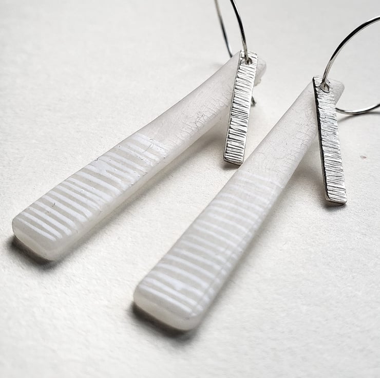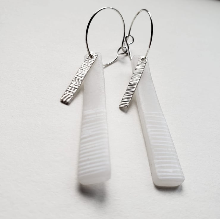 A contemporary pair of everyday drop earrings made with sterling silver and polymer clay on silver plated wire hoops.