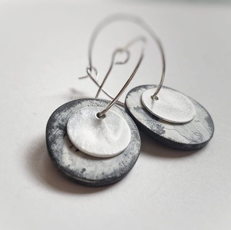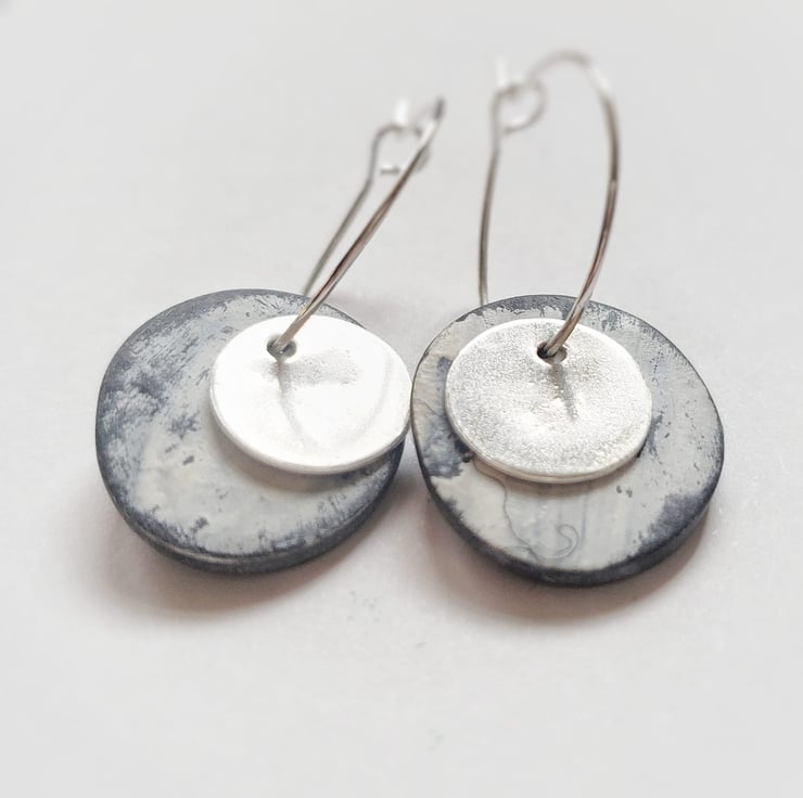 A contemporary pair of everyday drop earrings made with sterling silver and polymer clay on silver plated wire hoops.