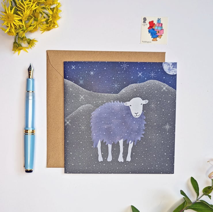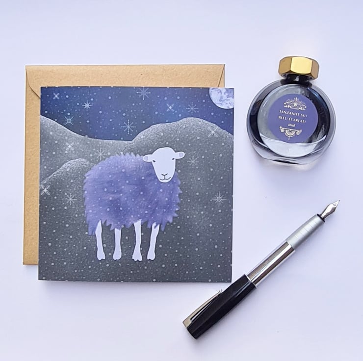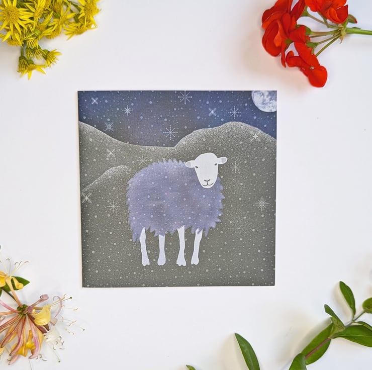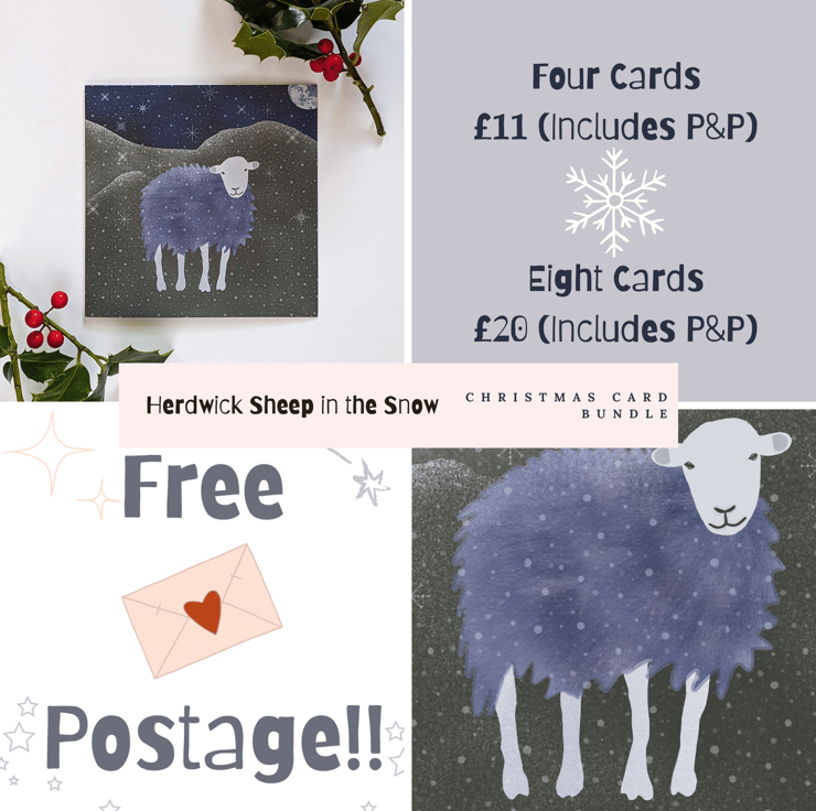 My digital artwork of a Herdwick sheep (the most beautiful sheep!) in the snow has been printed onto square 350GSM recycled card. Choose 4 or 8 cards