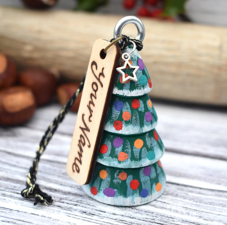 A hand painted Christmas tree, ideal to hang on your tree or anywhere you are festively decorating! This one is medium.