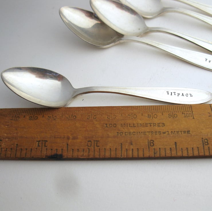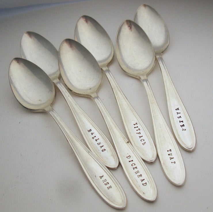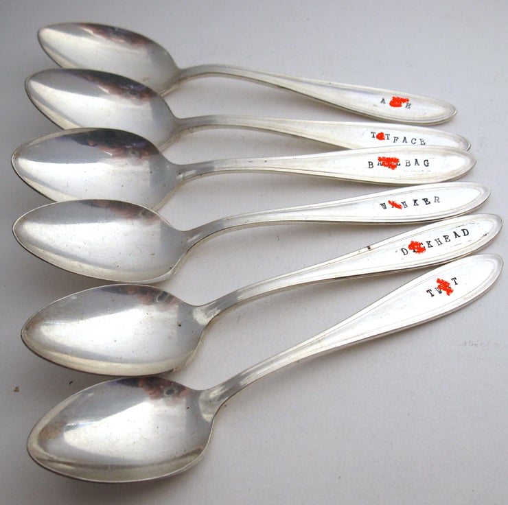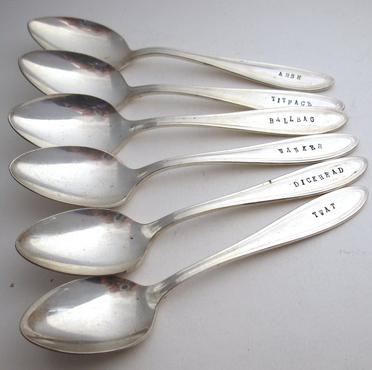 A matching set of six vintage silver-plated coffee spoons, each handstamped with a single insultingly rude word.
