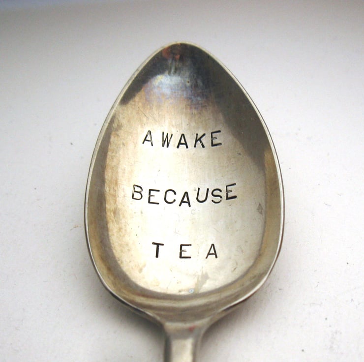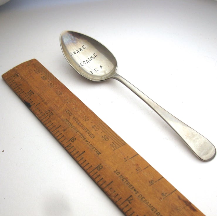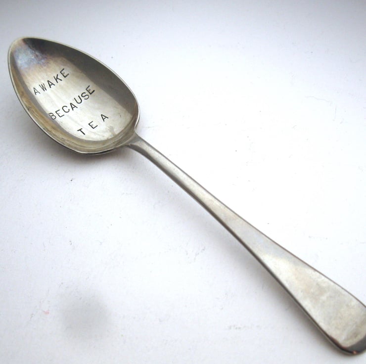 A hand stamped vintage nickel silver alloy tea spoon with the words AWAKE BECAUSE TEA. It's a plain 'old english' teaspoon measuring approximately 5" (12.5cm) long and I would guess it's 1940s. The stamping dies I've used are also 1940s.