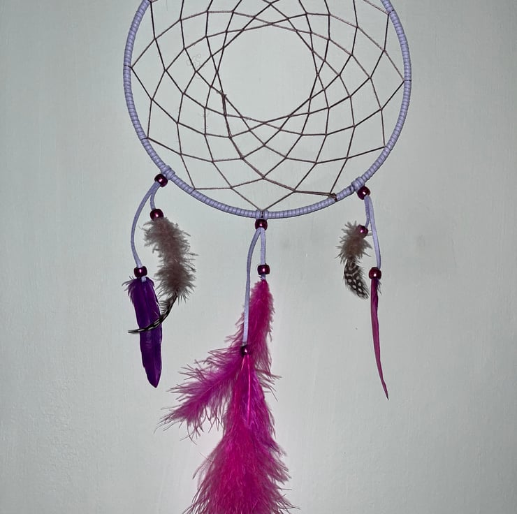 A purple Dream Catcher created using an 8" (20.3cm) hoop, with multicoloured feathers. Overall length about 16" (40.6cm)