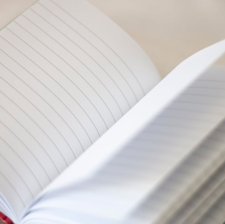 A lined red hardback notebook is included. Please see the photograph to see the line placement. (It is a standard size so the cover can easily be put on a new notebook when this one is full!