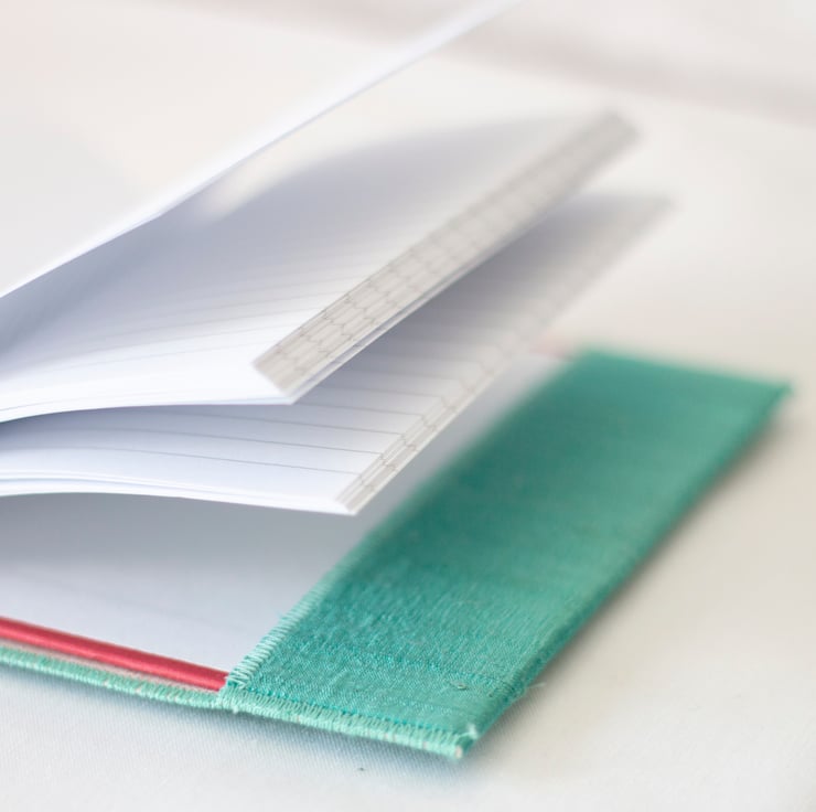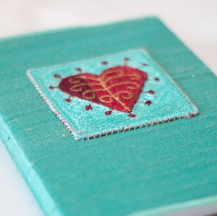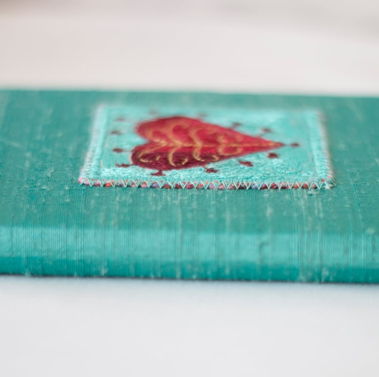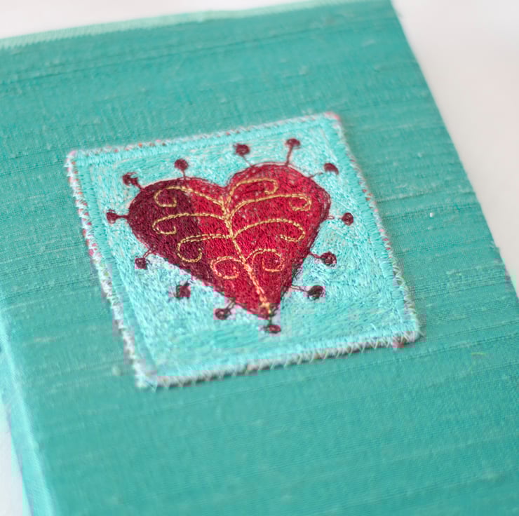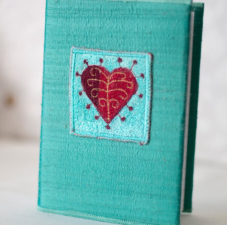 The front of the notebook features a thread painted heart design, made using deep red and light jade threads; they have a lovely sheen. The cover itself is made from shot silk fabric applied to a strong foundation so that the cover has structure.