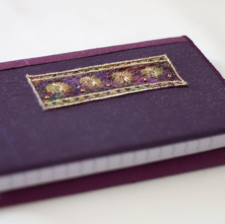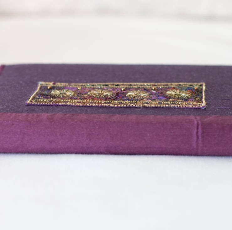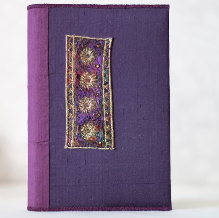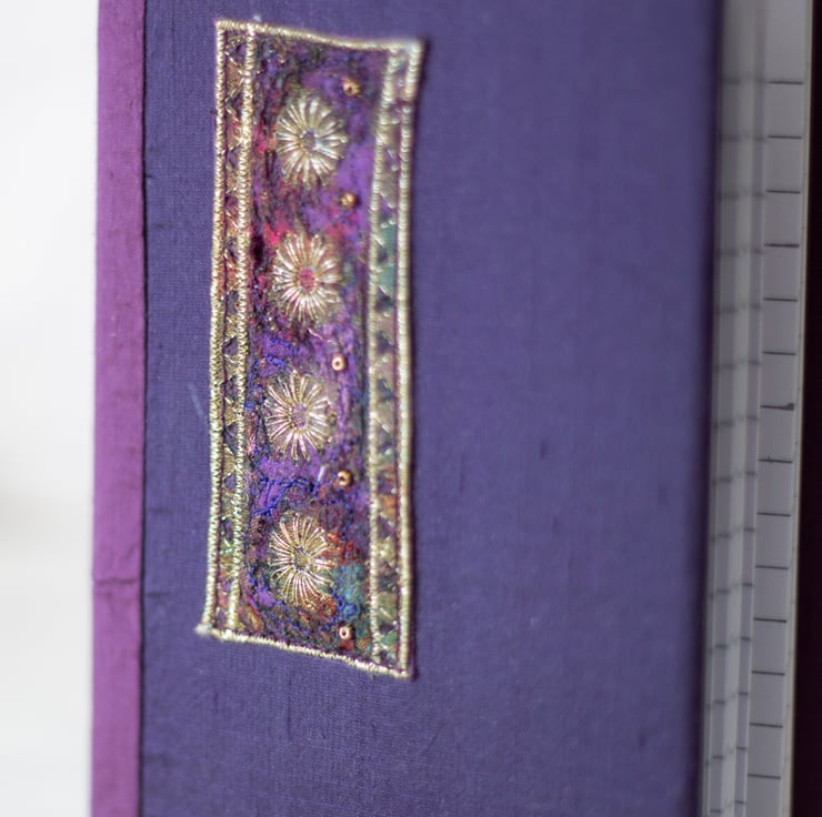 The front of the notebook features a textured, embroidered and beaded patch, which I have created using free motion embroidery with gold threads and soldering iron burning techniques. The cover itself is made from two shades of shot silk fabric applied to a strong foundation so that the cover has structure.