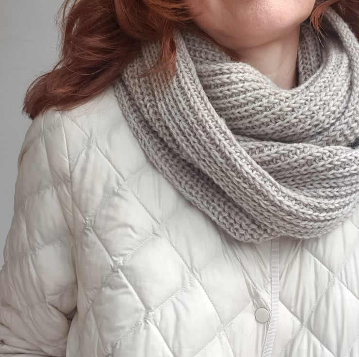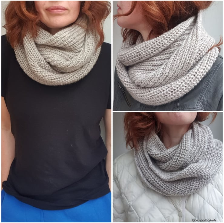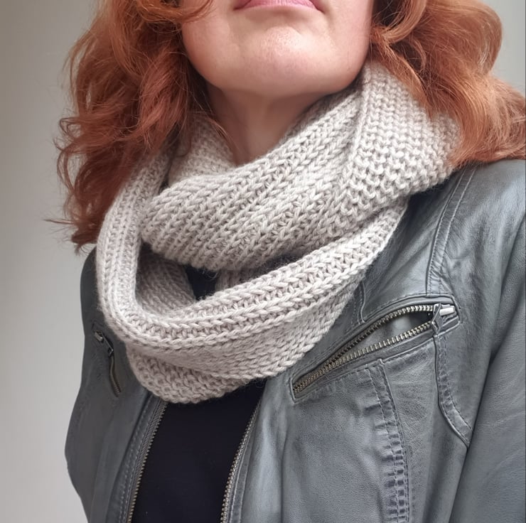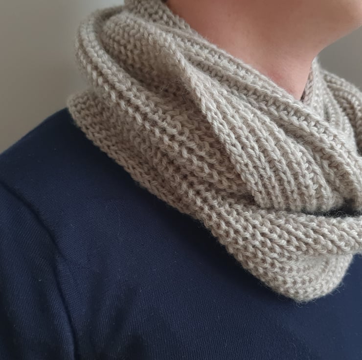 Hand knitted casual infinity snood/scarf from pure wool is MADE TO ORDER and available in many colours. Pictured scarf is made in colour 77 - Light Oak.