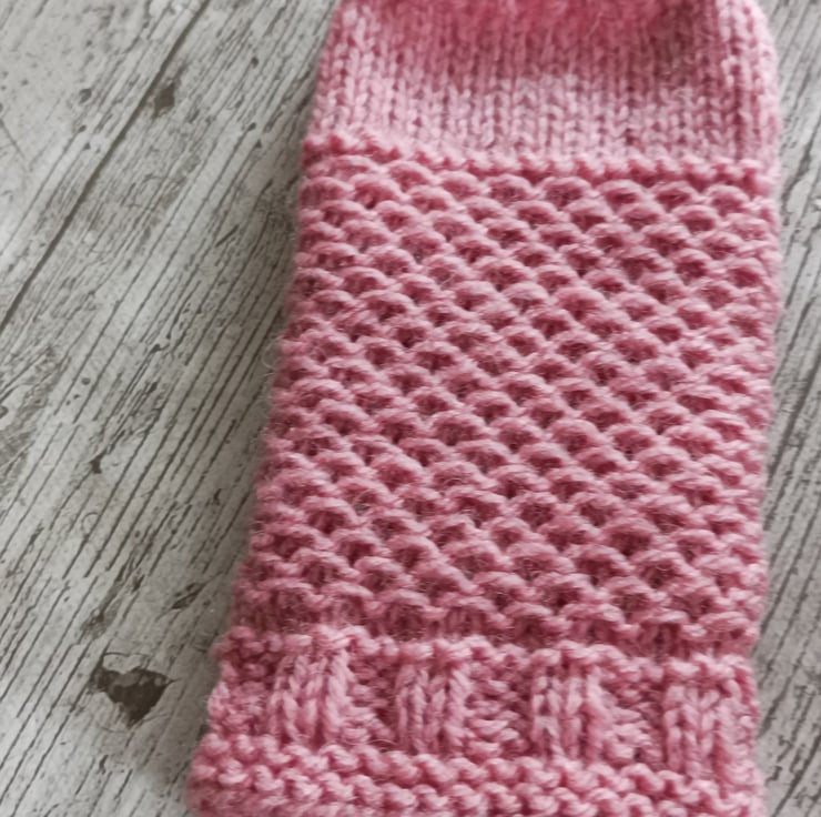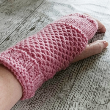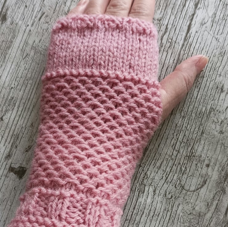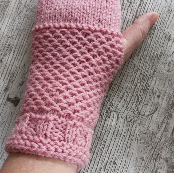 New design womens knitted fingerless gloves. Knitted in a rose pink shade. Knitted in acrylic with 25% wool fibres.