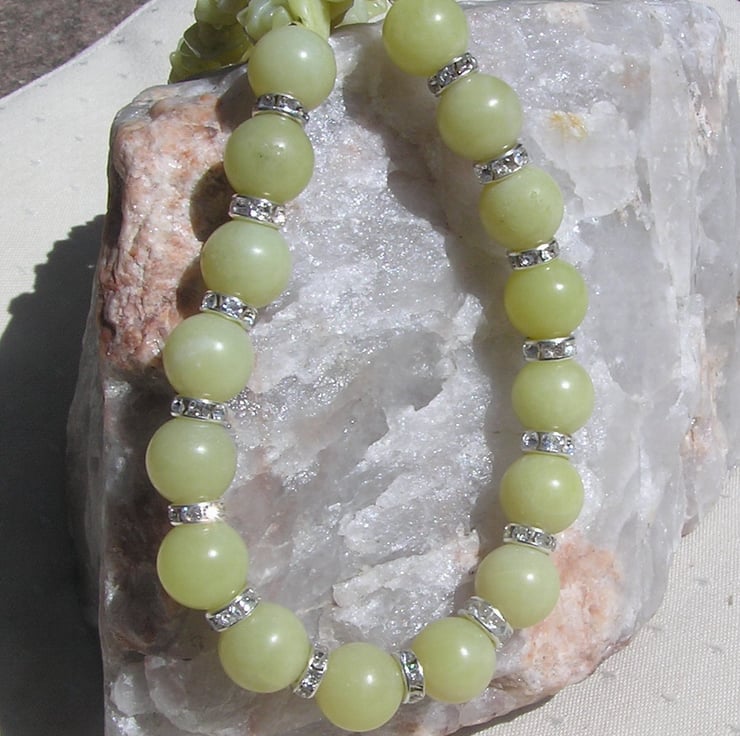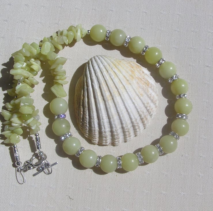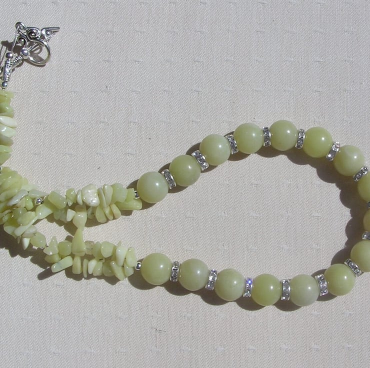 This Stunning Necklace is made from Lemon Jade Large round beads alternated with Glistening Crystal studded spacers finished by double-stranded Lemon Jade Gem-Stone Chips - a soothing Sunny effect that will look stunning either worn casually or with something more Elegant for a Special Evening out